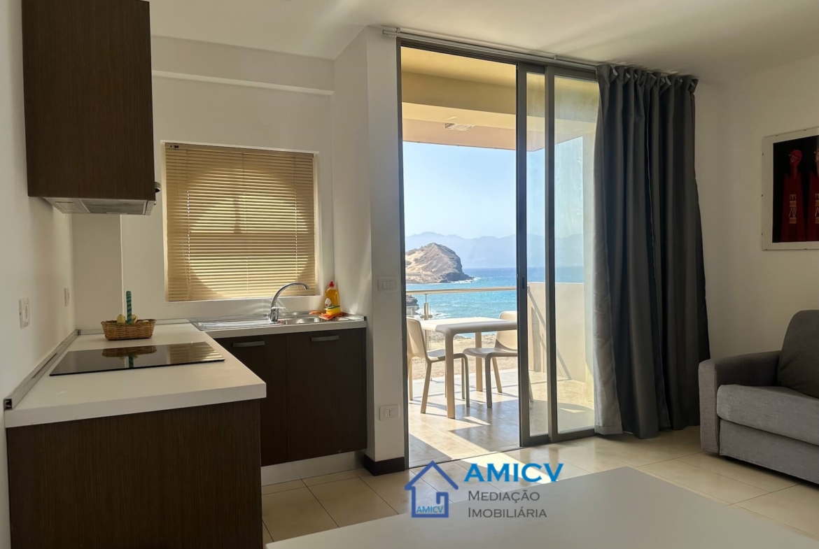 AMICV, Agência Imobiliária em Cabo Verde, apresenta este apartamento T1 com vista para o Oceano, situado no Aparthotel Las Rochas em Lazareto.